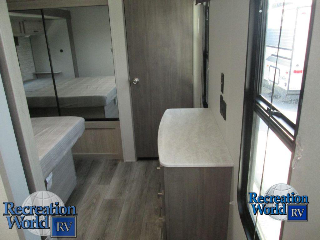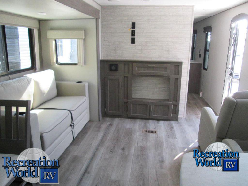 The 303RKDS is your home away from home! The rear kitchen steals the show with expansive counter space and abundant overhead storage. The location of the kitchen allows for a very spacious living room that includes two recliners directly across from the slide-out sofa. The bedroom includes its own entertainment center and fireplace, an enormous closet with full length hang rod and shelves, as well as an additional utility closet complete with everything you need to add a washer/dryer.Air ConditionnerHeating SystemOutdoor KitchenFull KitchenLarge Living Space & Separate BedroomFull BathroomLots of Storage