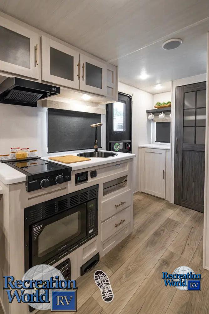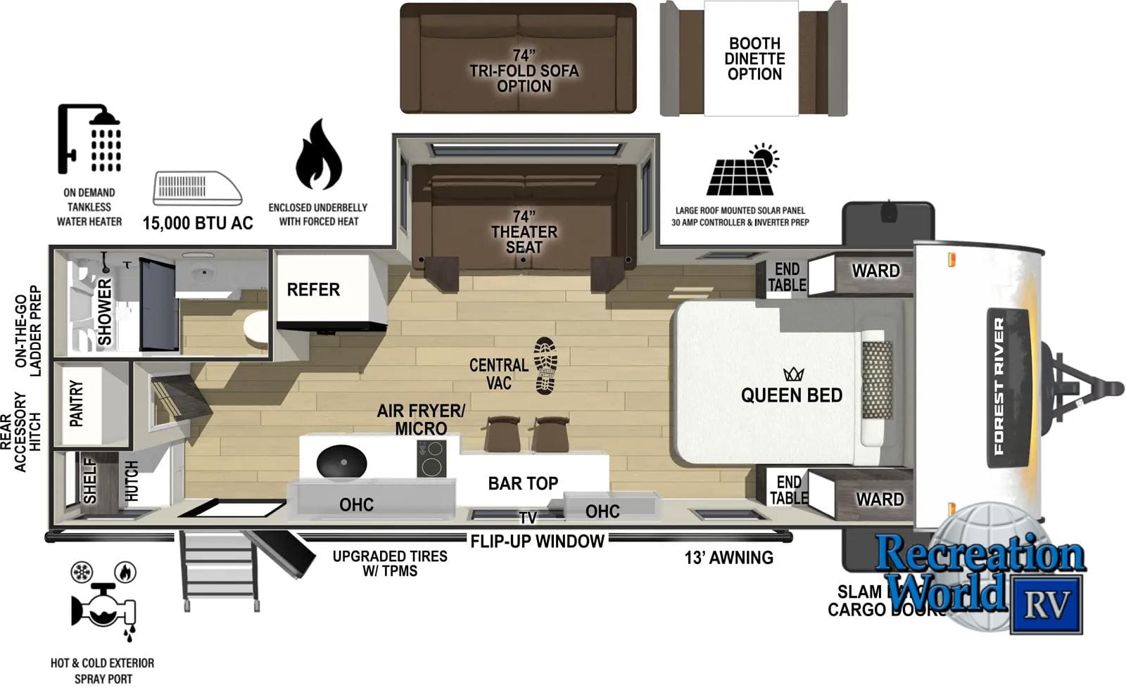 The RP-206 is a compact, modern travel trailer designed for comfort and convenience. It features a front queen bed, rear full bath, theater seating (with optional extra sleeping), and a fully equipped kitchen with a bar top and flip-up window. With added perks like solar power, a 15K A/C, tankless water heater, and outdoor features like a 13' awning and spray port, it’s perfect for easy and enjoyable adventures on the road.